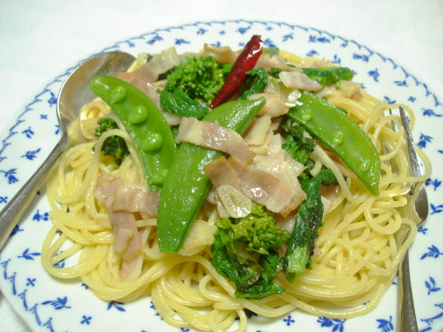 菜の花とスナップエンドウとベーコンの春を楽しむパスタ~