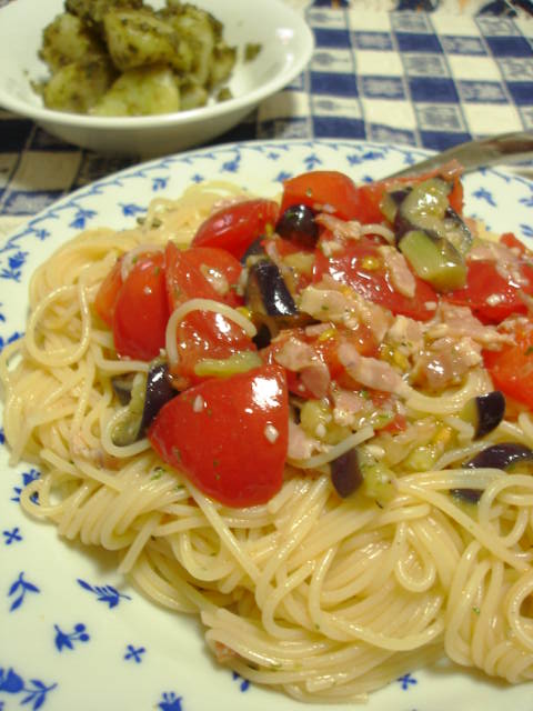 冷製パスタが食べたくなって、トマトとナスのパスタにしました。